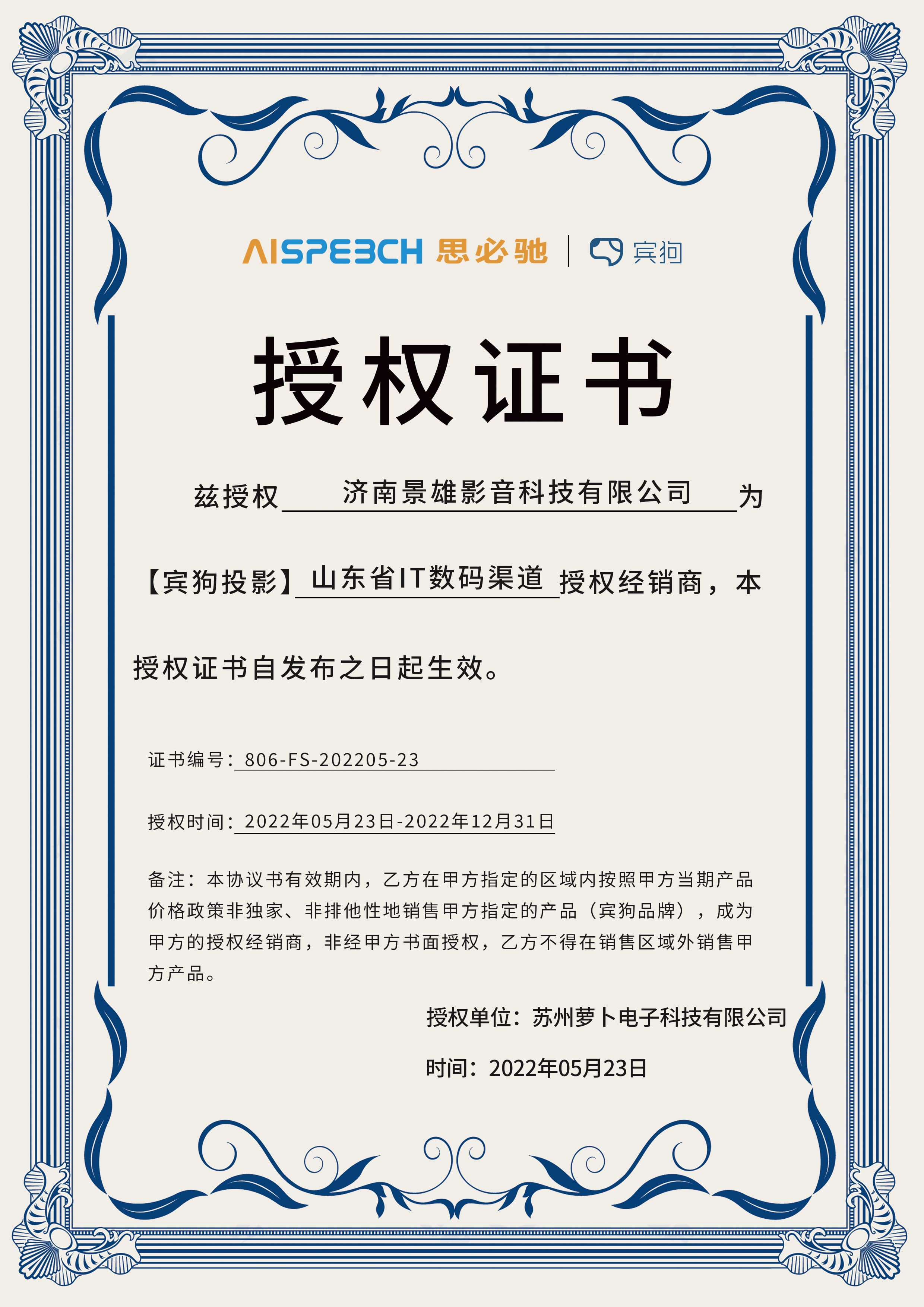 賓狗授權證書